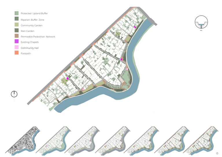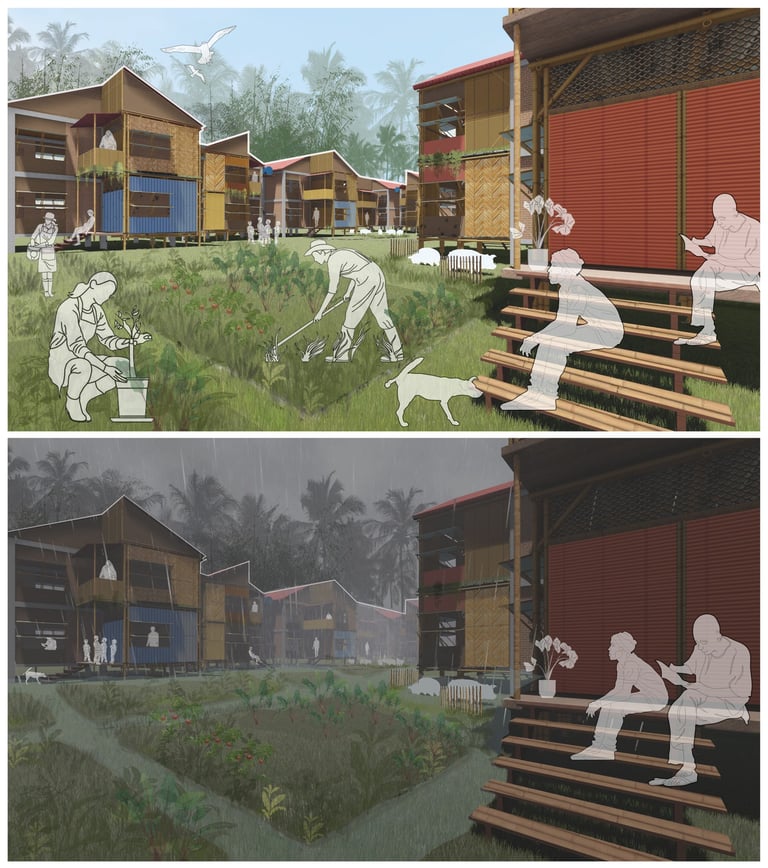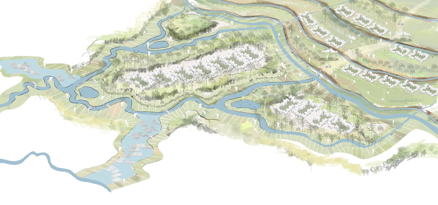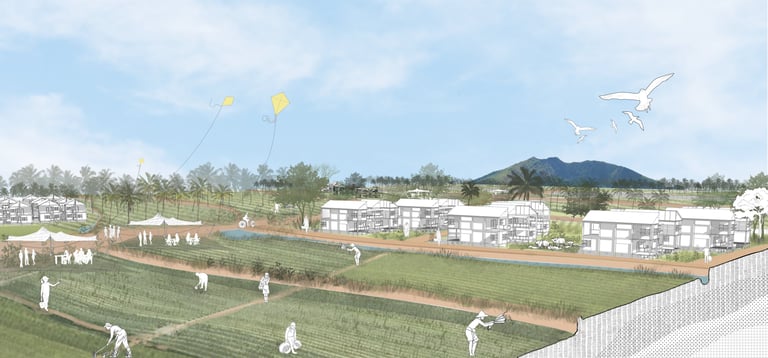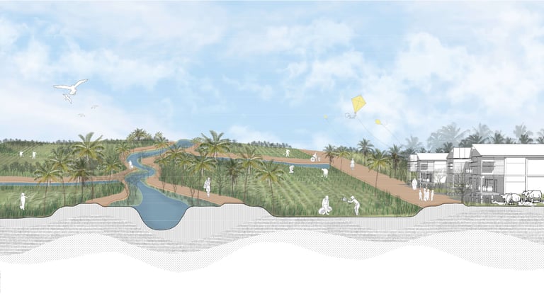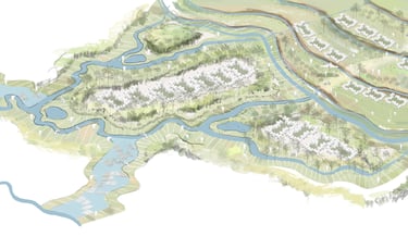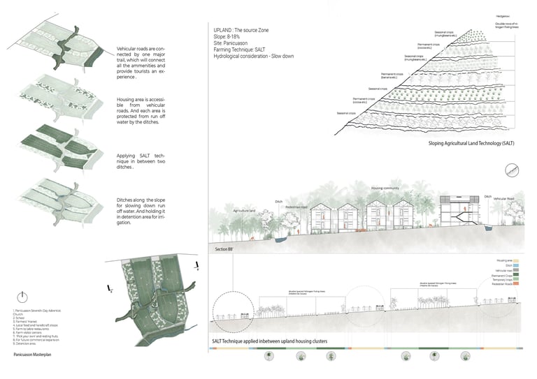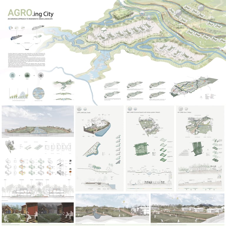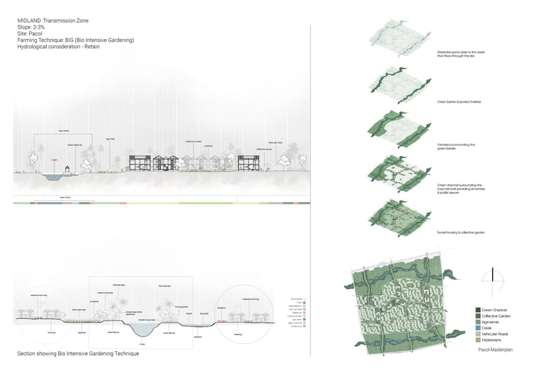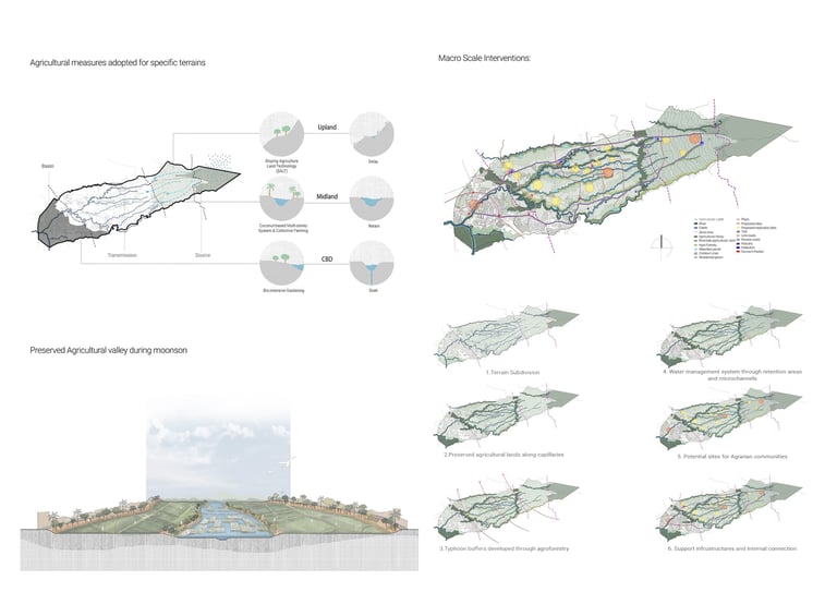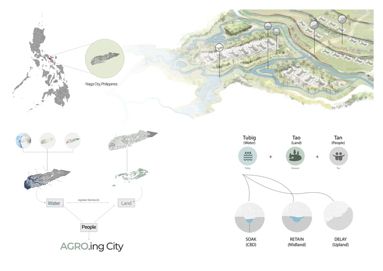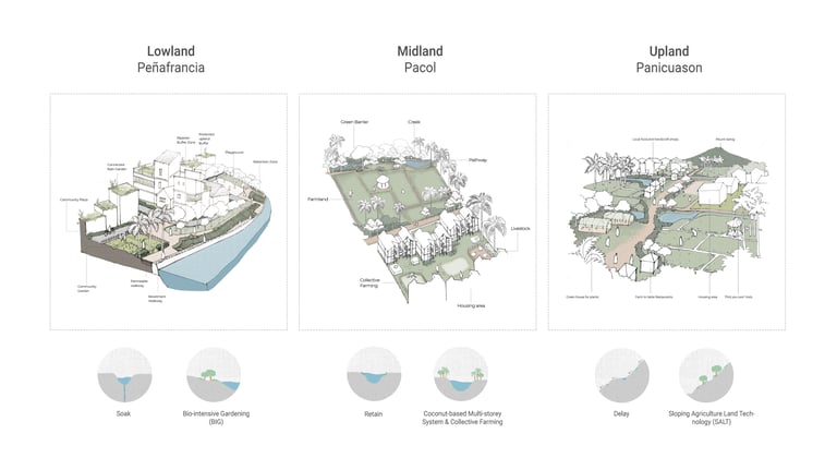 Our proposal seeks a way to manage these two major natural forces in Naga city under an integrated agricultural system that, in turn, regenerates this landscape and achieves ecological, economic, and social resilience. To achieve our vision, we subdivide the landscape according to topographic slope and hydrologic movement- Upland (source) ,Midland (Transmission), CBD (Basin ) to mitigate, adapt and reinstate the effects of climate change in Naga City through a comprehensive landscape strategy and water management system in different scales. The proposal acknowledges the existing farmlands and capillaries as an integral part of the overall hydrological system and seeks answers to housing needs and further growth without interrupting these systems. It suggests an integrated framework that is landscape-sensitive, economically viable, carbon-efficient, and replicable.