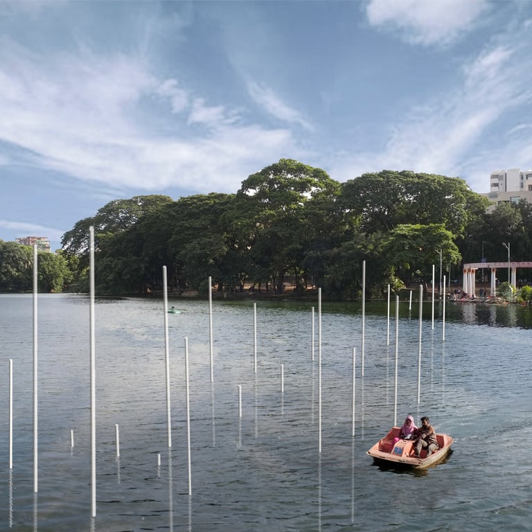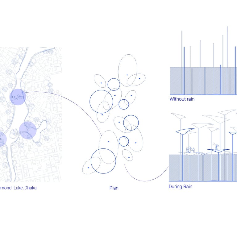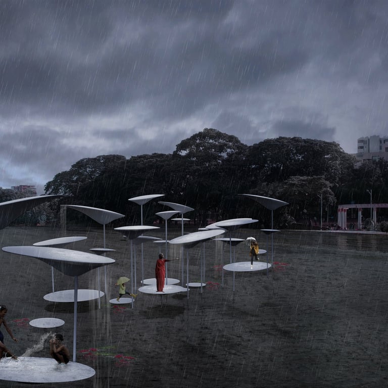 For a tropical country like Bangladesh, monsoon is lengthy and already eventful. The drive behind this design was to glorify this attribute, to implement something to a very well known environment so that when it starts to rain, the space itself suddenly creates a newer ambience to celebrate that reviving enthusiasm that comes with the blissful shower of rain.