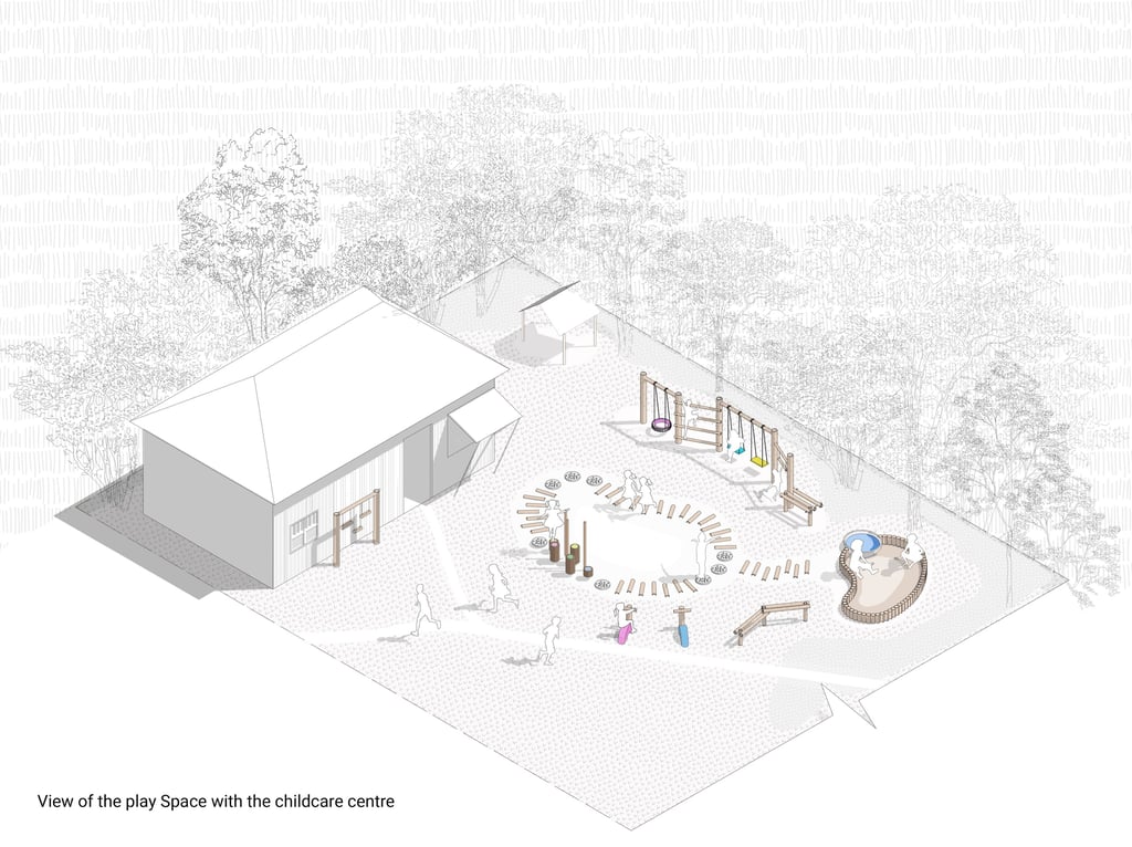 The design features a central, multi-functional play apparatus that was co-designed with children, incorporating elements like a swing, ladder, and hanging features. The space is further enriched with a dedicated running path, a sand and water corner, tire horses, and log-hops, providing a variety of sensory and physical experiences.