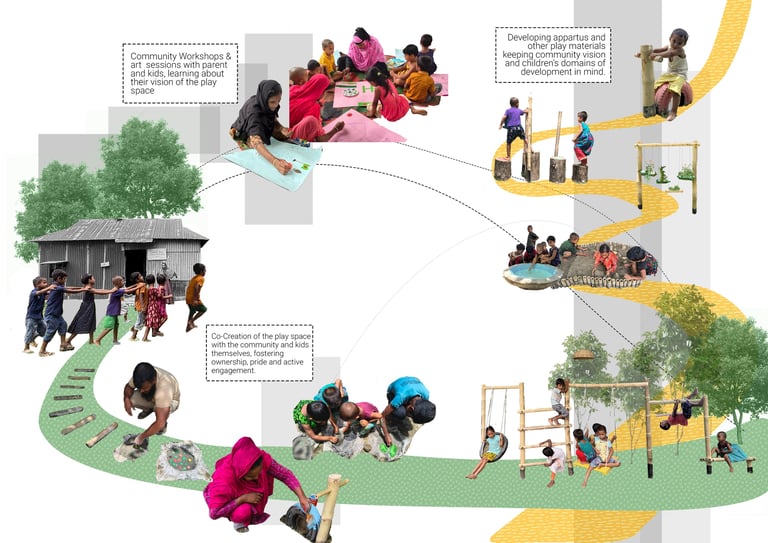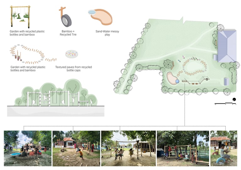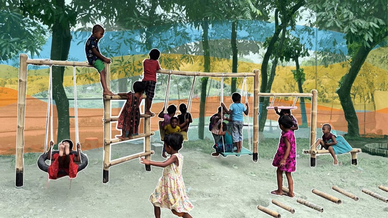This project introduces a scalable and sustainable model for outdoor play spaces in integrated community-based childcare centers across Bangladesh (ICBC Bangladesh). The objective was to desing a series of prototype play apparatuses that supports children’s development through a connection to nature, while remaining accessible and replicable. By utilizing readily available, low-cost local and recycled materials, the design prioritizes affordability and ease of construction for community members. A key component of this project was co-creation; working directly with the community and children in every step, from design to construction, fostered a strong sense of ownership and pride.
