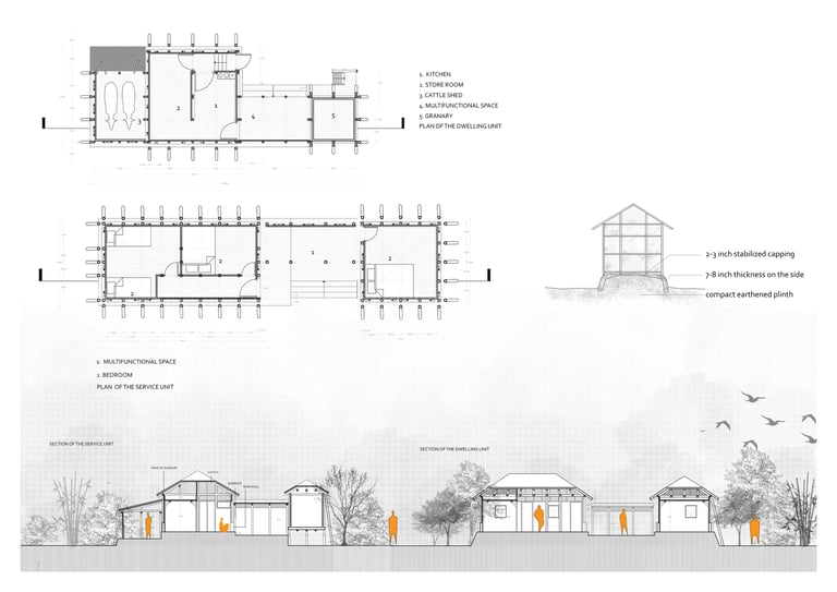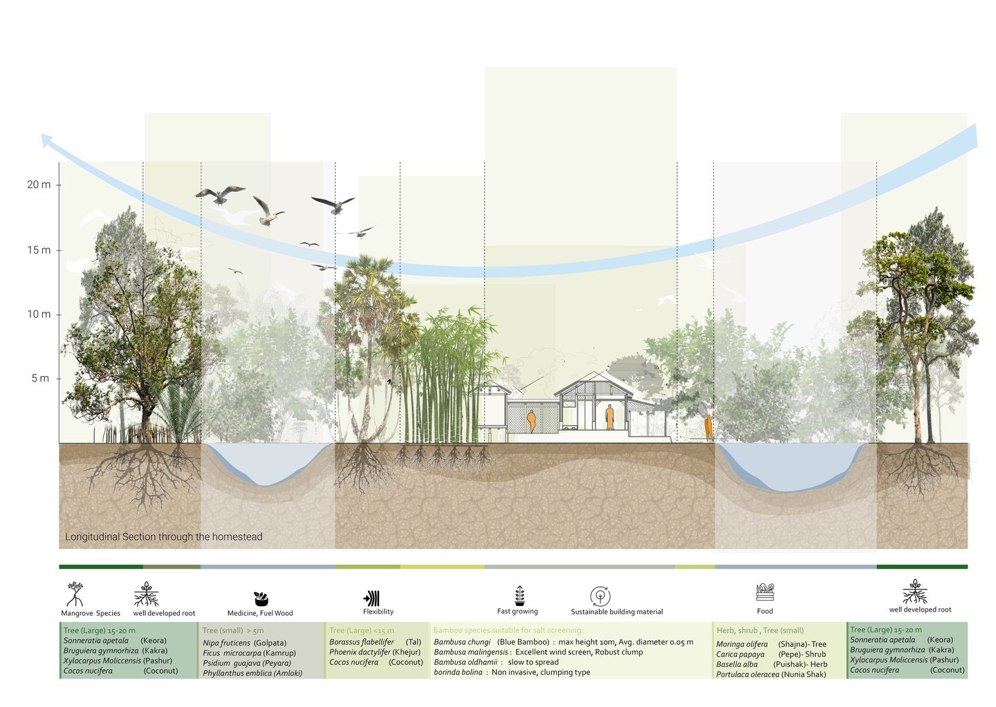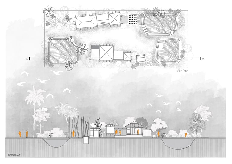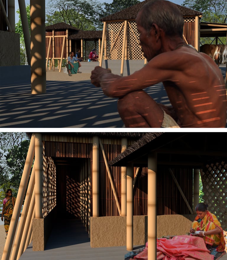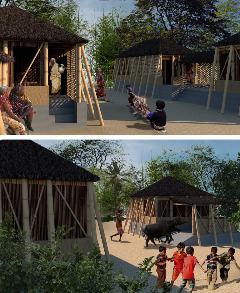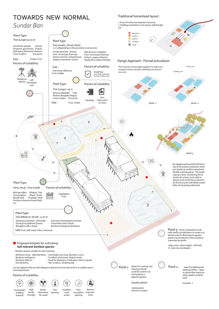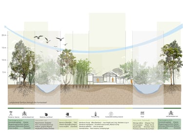 Our aim is to gradually shift towards bamboo as primary and more sustainable building material by initially incorporating them in a layering of vegetation towards the direction of the cyclone. This would take the first blow and help mitigate the impact of cyclone on building structures. For better protection, the existing functions are clustered under two strong bamboo structures that draws inspiration from the stilt root system of the mangrove. Three ponds are proposed to provide solution for the scarcity of water. Separate ponds towards inner court provide water for cooking and bathing. The one on the embankment end act as a retaining pond in case of flood and double as backup source if necessary